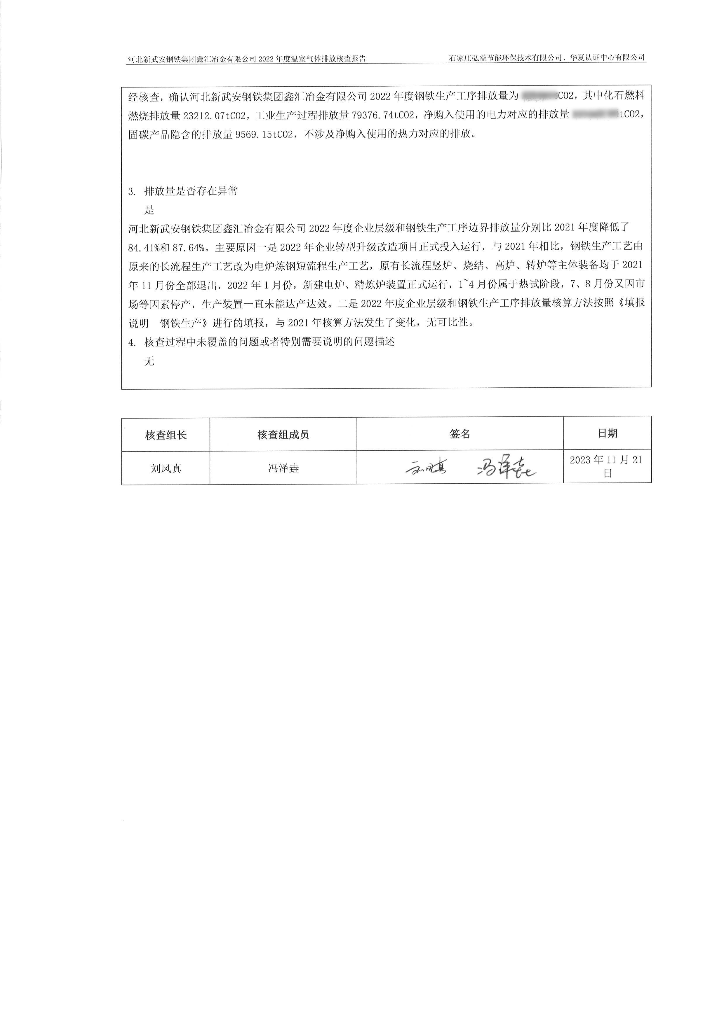 2022年河北新武安鋼鐵集團鑫匯冶金有限公司碳排放核查報告